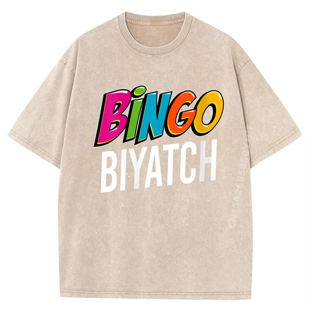 A women’s short sleeve T-shirt with a humorous bingo print and vintage wash finish. Soft, comfortable, and great for everyday wear. Easy to style for game nights or casual outings.