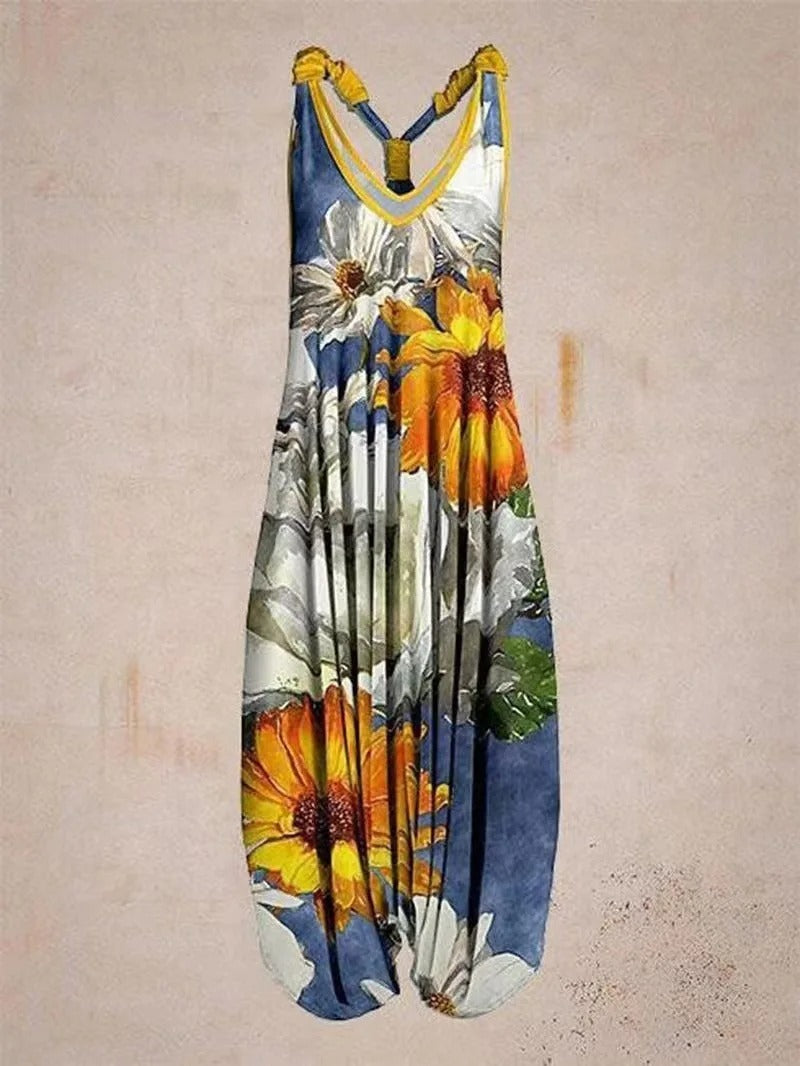 A sleeveless floral romper with a vintage feel. Light and comfy for summer, with a flattering high waist. Easy to wear for casual days or going out.